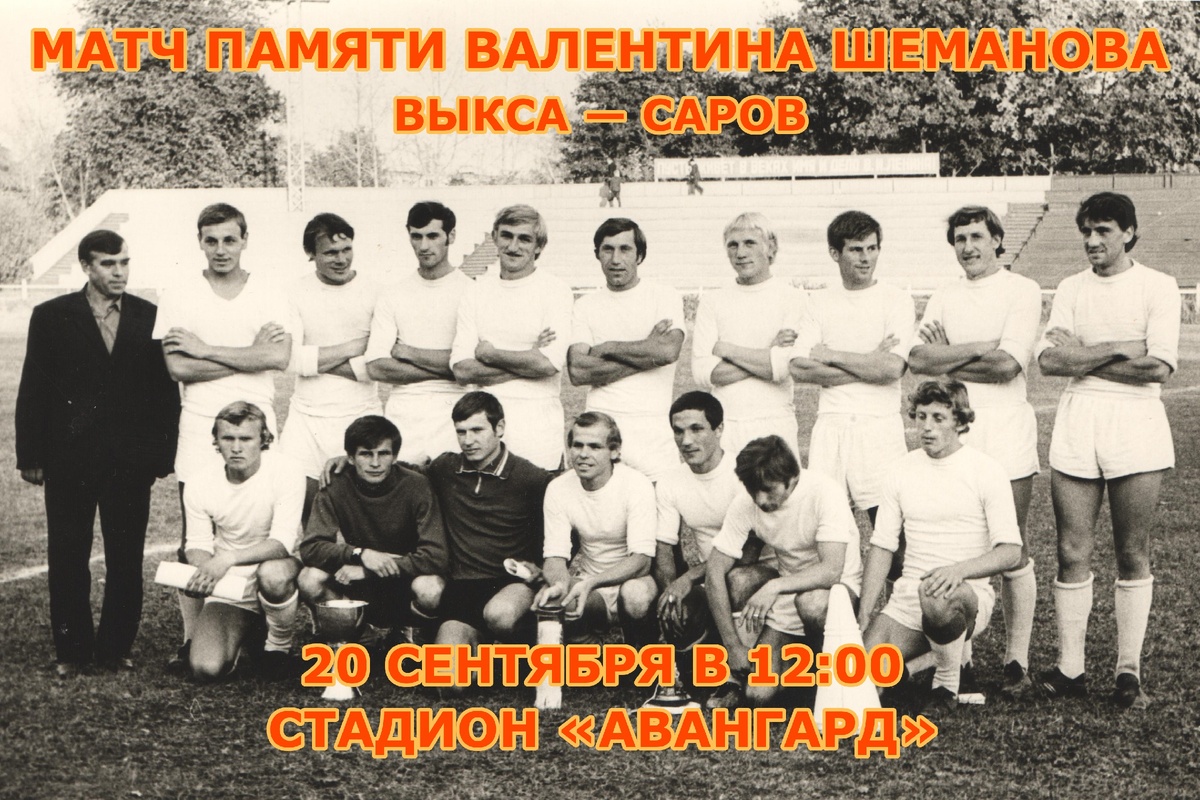 В воскресенье, 20 сентября, на стадионе «Авангард» состоится матч памяти легендарного игрока и тренера Валентина Шеманова. Встретятся ветеранские сборные Выксы и Сарова. Начало в 12:00. В составе выксунской команды будут выступать воспитанники Валентина Шеманова, которых он привёл к чемпионскому званию в 1974 году. Валентин Степанович Шеманов родился 22 ноября 1927 года в деревне Высокой Ермишинского района Рязанской области. С 1945 по 1961 годы играл в нападении за «Авангард» (до 1953 года команда называлась «Машиностроитель»), а в 1946 и 1947 годах — за сборную Выксы. В 1950-м и 1954-м он параллельно выступал за «Металлург». Вместе с «Авангардом» Валентин Шеманов стал чемпионом Арзамасской области, трижды брал серебро чемпионата Горьковской области. Также на его счету две победы в кубке Горьковской области, по одной — в кубке Арзамасской области, кубке областного совета ДСО «Труд» и спартакиаде Горьковской области. После завершения карьеры Валентин Степанович работал тренером. Он воз