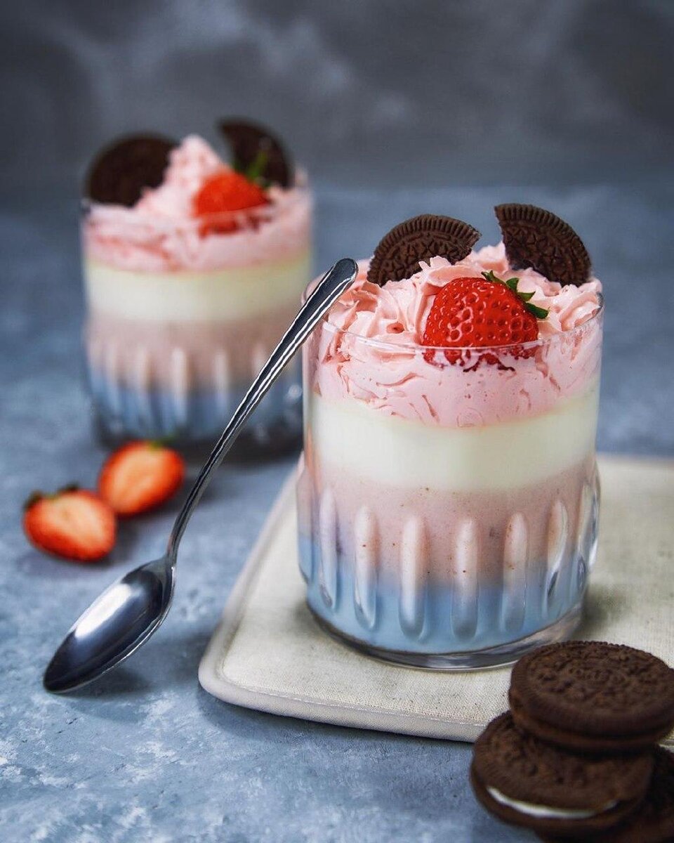На вкус получился очень пикантным за счёт голубого чая и мартини. Вдобавок ещё покрошили сверху печеньки ореоро.