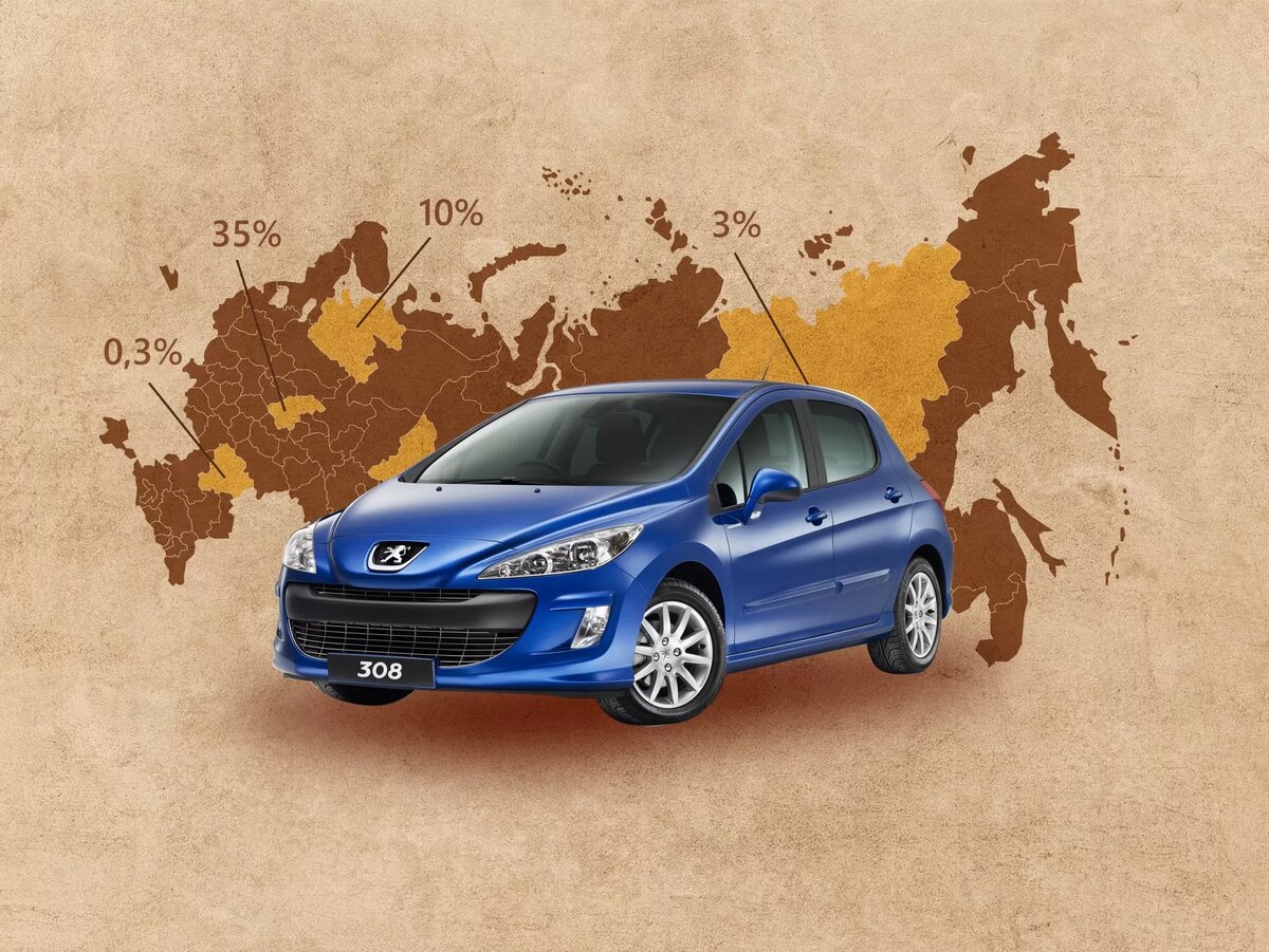 Картина распределения предложений о продаже Peugeot 308 по стране несколько нестандартная. Больше всего машин, как водится, предлагается в Москве: в нашем случае это чуть более четверти объявлений. Санкт-Петербург тоже ожидаемо скромен: здесь продается менее 10% от всех машин в стране. На юге России собрано менее 15% предложений, и это вполне обычная цифра. А вот Поволжье, которое традиционно аккумулирует довольно большой объем предложений, в этот раз собрало лишь 15%, и это уже чуть меньше, чем у Ford Focus или тем более Kia Rio. На Урале машин мало, немногим более 5%, а в Сибири и того меньше. Отсутствие предложений на Дальнем Востоке уже не удивляет: там даже признанные леворульные бестселлеры остаются штучным товаром.