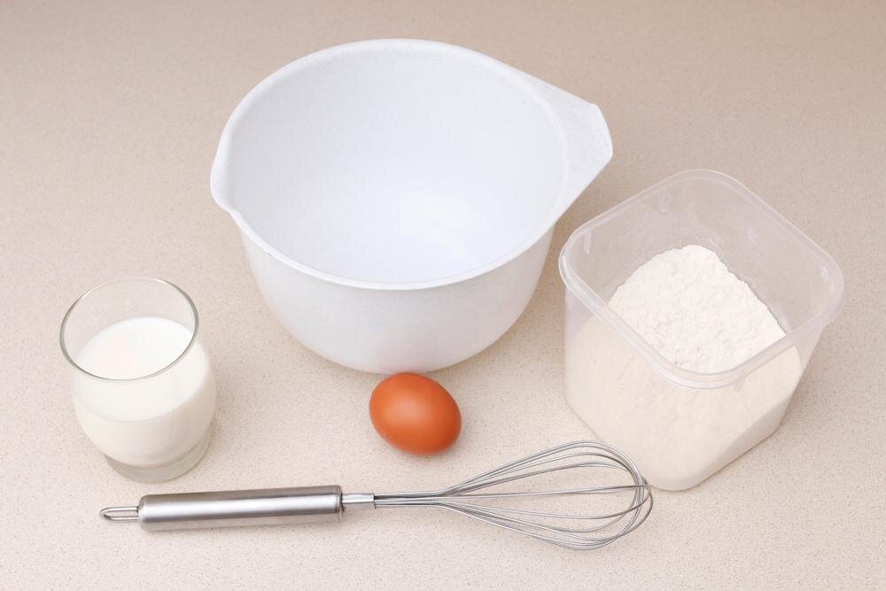 Для блинов вам понадобится: 1 яйцо, 1,5 стакана молока, 1 стакан муки, 1 щепотка соли, жир для жарки, миска и венчик.