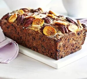 Нагрейте духовку до 180 °C. Выстелите 900 граммовую форму для выпечки предварительно уложив антипригарную бумагу для выпечки, смажьте небольшим количеством масла, чтобы она прилипла. Положите финики в небольшую кастрюлю с 200 мл кипятка и тушите 5 минут. Слейте жидкость в кувшин, затем положите финики в кухонный комбайн. Добавьте бананы и 100 мл финиковой жидкости и взбивайте до однородной массы. Смешайте в миске орехи, сухофрукты, поленту, специи и разрыхлитель, затем добавьте пюре из фиников и ром и перемешайте до однородности.