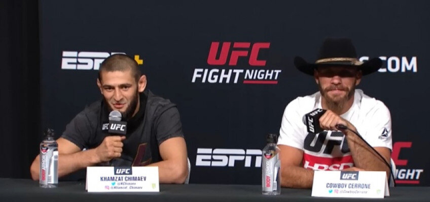 Известный полусредневесы UFC Хамзат Чимаев и Дональд "Ковбой" Серроне сохранили нормальные отношения, несмотря на конфликт в отеле с участием еще одного бойца. На пресс-конференции перед UFC Fight Night 178 чеченский боец со шведским паспортом признался, что уважает легендарное наследие Серроне, но все-таки будет вынужден его "размазать". Диалог выглядел следующим образом, передает AllBoxing. Серроне: "Мои поражения были от Гейджи, он чемпион, Тони Фергюсона. Я дрался с довольно хорошими бойцами".Чимаев: "Я хочу увидеть его бой".Серроне: "Ха-ха. Вот и он, вероятно, со мной хочет драться. Ха-ха-ха".Чимаеву: "Ты легенда, но я должен тебя размазать, брат". Далее "Ковбой" похвалил Чимаева, отметив, что чеченец правильно относится к делу – по крайней мере, пока у него получается разбираться с теми, кого он обещал "размазать". Сам Дональд признался, что старается в каждом поединке, но у него не всегда получается побеждать. После журналист поинтересовался по поводу конфликта в отеле, когда Ч