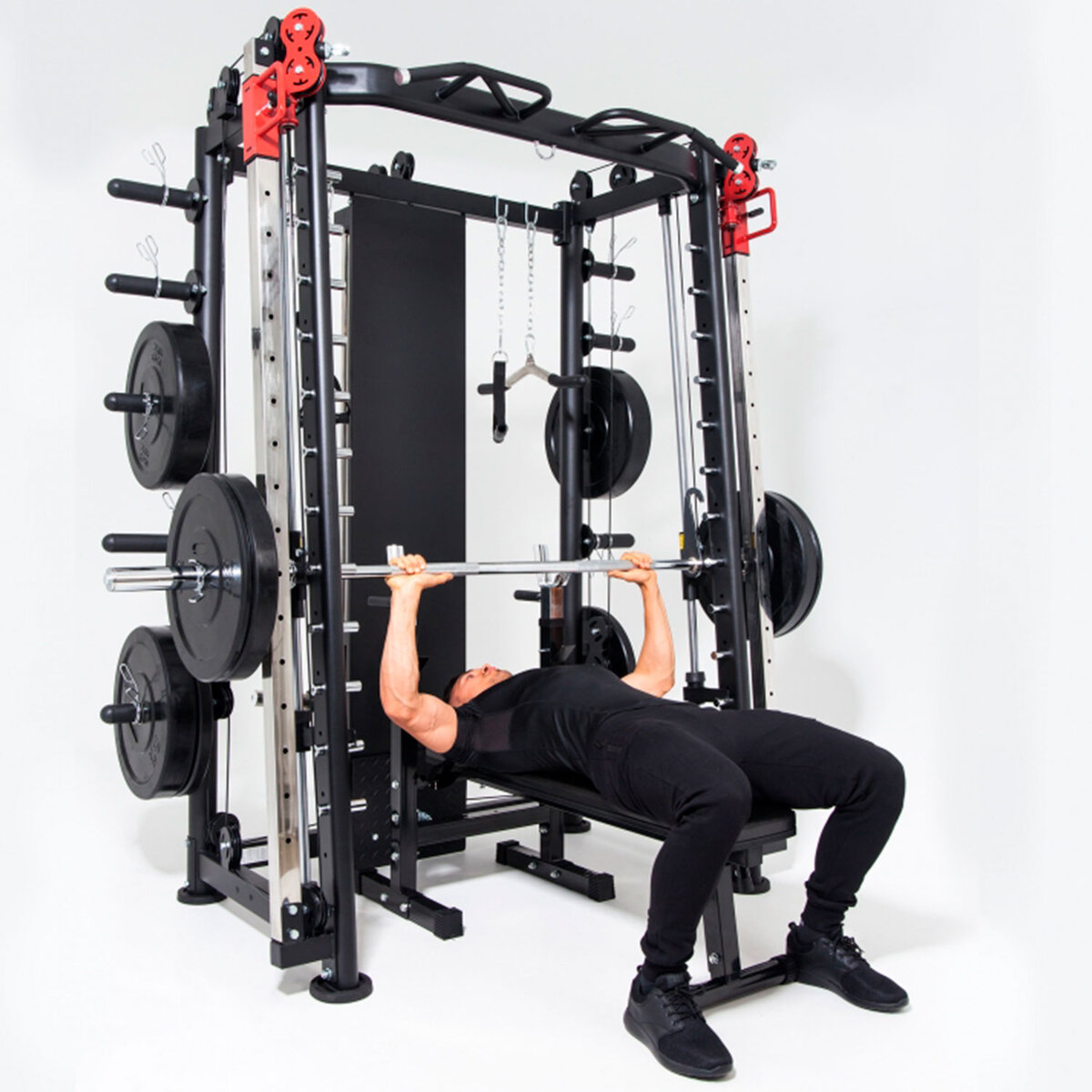 При сочетании со скамьей спортсмен может выполнять жим в силовой раме лежа или сидя без необходимости в дополнительной подстраховке. Но наиболее часто данная конструкция используется для приседаний со штангой или становой тяги.