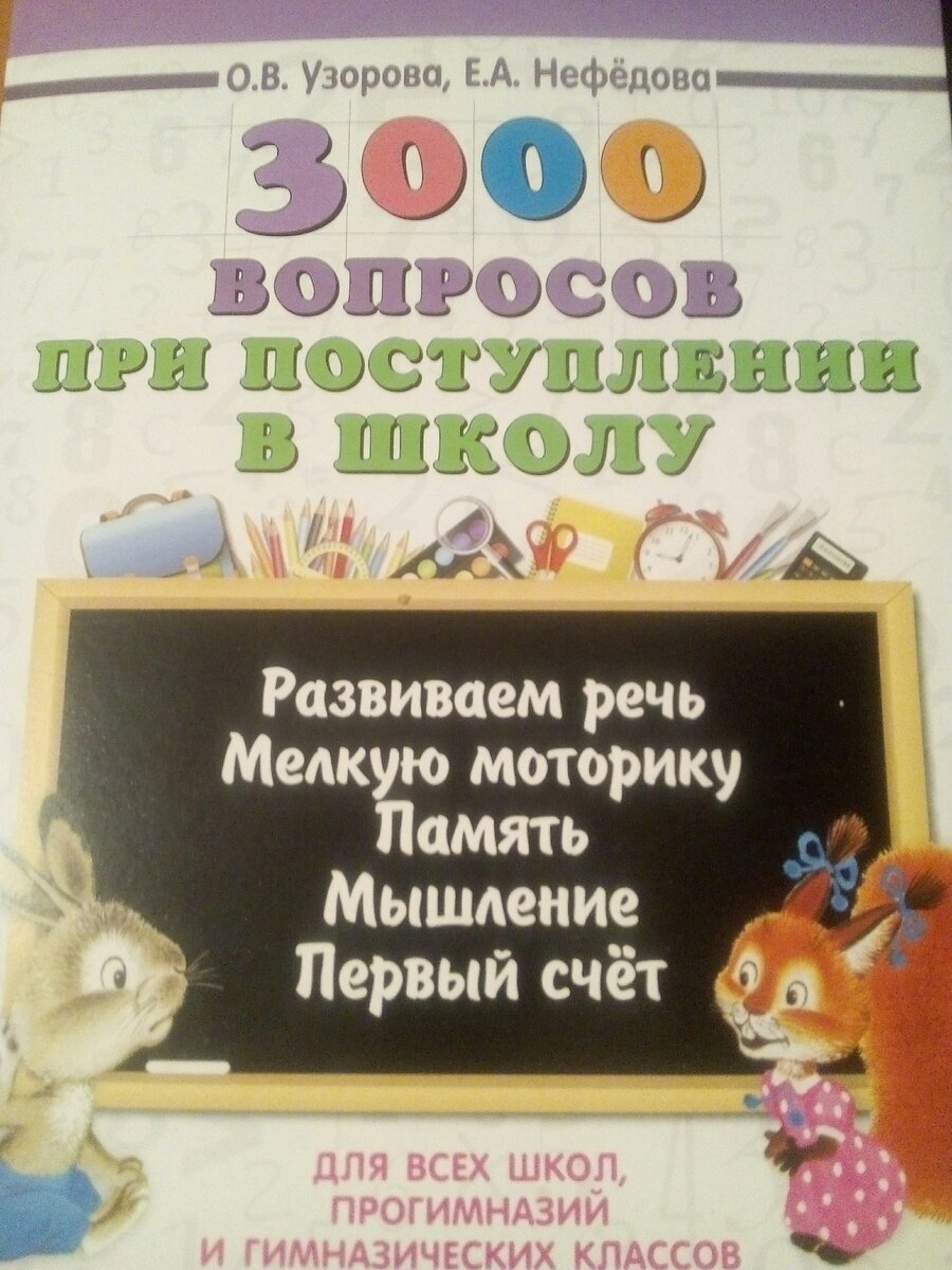 Купила на днях книгу Узоровой и Нефёдовой под шокирующим названием " 3000 вопросов при поступлению в школу". Почему с "шокирующим"? Так представьте сами, что вашему будущему первоклашке начнут при поступлении задавать такого плана вот вопросики, а всего-то он должен знать ответы на 3000 вопросов!!!