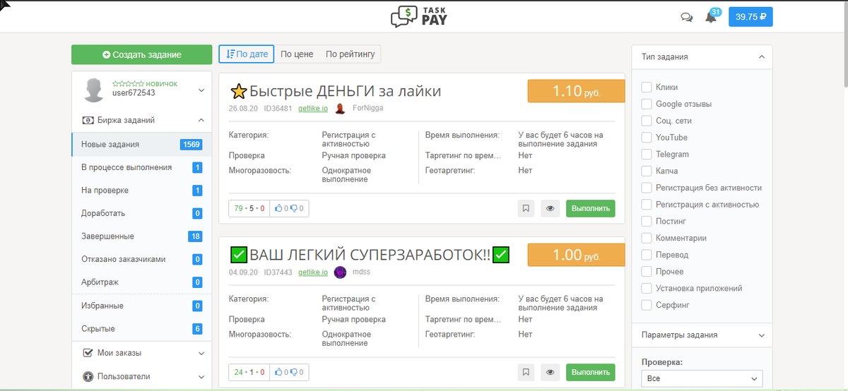 Добрый день, дорогие читатели моего блога! на просторах интернета я нашел совершенно новую биржу с заданиями, где можно легко заработать выполняя простые задания! И так, мы начинаем! После того, как мы прошли прошли простую регистрацию, мы получаем свой профиль и стену с заданиями. Задания высокооплачиваемые и выполняются совершенно легко. Какие же задания там есть? Регистрация с активностью и без, регистрация в ботах телеграмма! Перейти по ссылке, оценить пост! Посетить другие сайты и многое другое! Средняя цена - 1р. Есть совершенно простые задания, где платят и по 10р. За 2 часа моей работы я поднял 40р! Это довольно не плохо для старта! Так же здесь и рубрика "Топ пользователей по заработку". Вы только посмотрите, сколько здесь зарабатывают! И вы так же можете! Сайт очень простой! Заработать можно легко! В любой локации, в которой вы находитесь! Вам же просто надо тратить только время, в любую свободную минуту! А чтобы зарабатывать такие деньги, просто нужно перейти вот по этой с