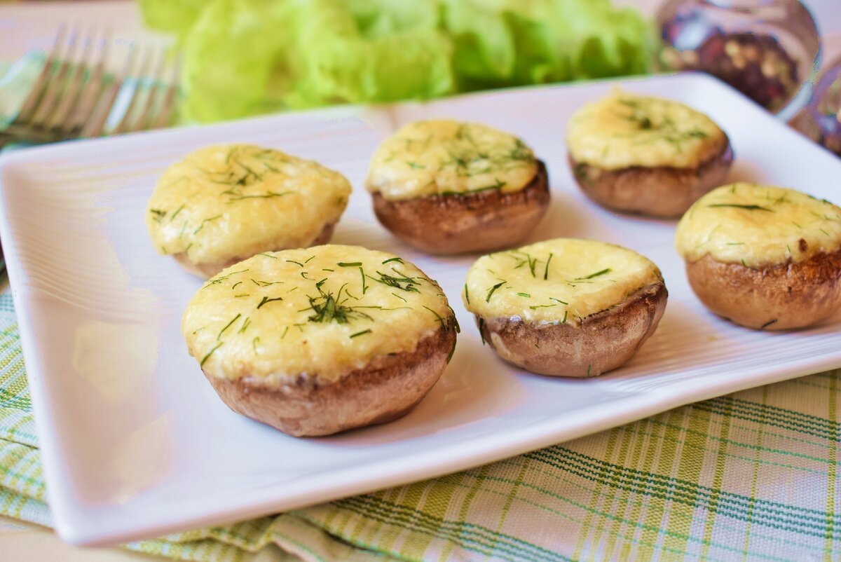 В наше время свежие шампиньоны уже не редкость. Но не все знают, что можно с ними приготовить. Шампиньоны, приготовленные в духовке с сырной начинкой, превращаются в универсальную закуску для любого застолья. Ингредиенты: Для приготовления этой закуски выбирайте наиболее крупные шампиньоны. Учитывайте, что при запекании, грибы еще немного уменьшатся в размере. Свежие шампиньоны промойте в проточной воде и сразу обсушите, чтобы они не успели размокнуть. У каждого грибочка удалите ножку, как можно ближе к основанию шляпки. Для запекания можно взять любую подходящую посуду. Я решила использовать керамическую форму для запекания. Дно формы смажьте небольшим количеством растительного масла и выложите шляпки грибов. В каждую грибную шляпку выложите небольшой кусочек сливочного масла. Это придаст готовому блюду сочности. Для приготовления сырной начинки натрите сыр на мелкой или средней терке. Добавьте к тертому сыру немного майонеза и измельченный чеснок. Все ингредиенты хорошо перемешайт