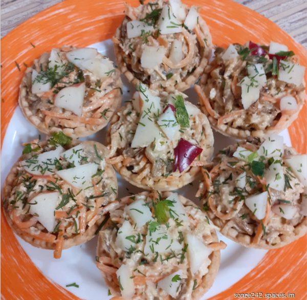 6) Перемешиваем все ингредиенты, по желанию наполняем салатом тарталетки. При подаче украшаем кусочками яблока и любимой зеленью.