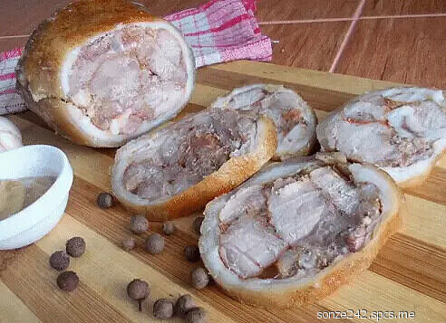 Охлаждаем сальтисон в холодильнике под небольшим прессом не менее 6 часов (у меня охлаждался всю ночь)