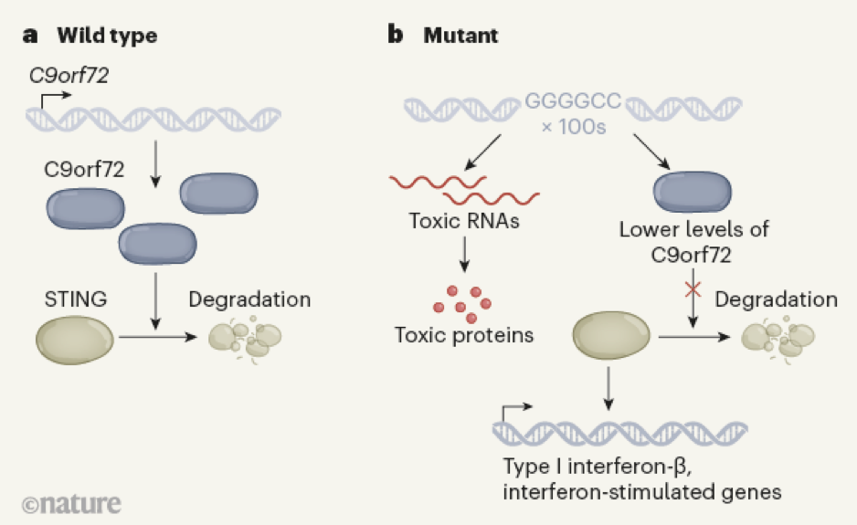 Таким образом, уменьшение уровня C9orf72 приводит к увеличению концентрации STING. Это легко объясняется, ведь у здорового человека STING разрушается, его уровень не превышает определенного порога. Регулирование этого разрушения – одна из функций белка C9orf72. Мутированный белок C9orf72 приводит как к замедлению такого разрушения, так и к появлению токсичных белков.