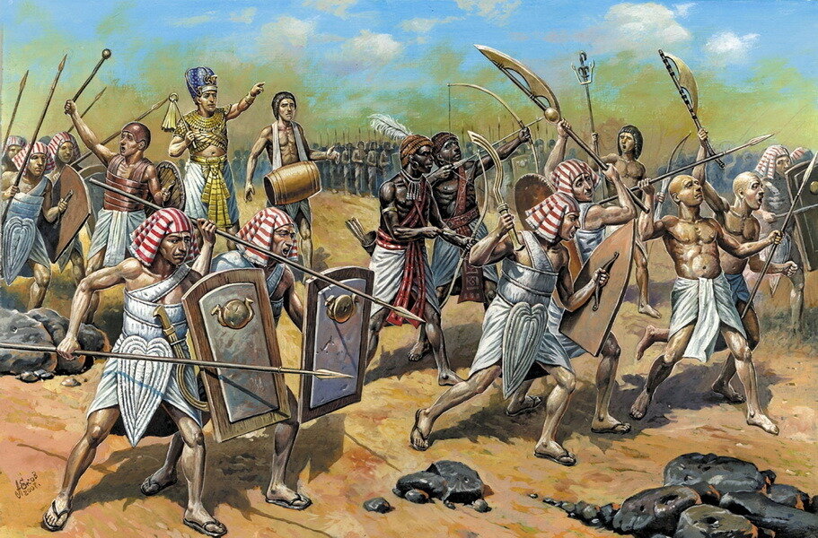 История древних государств изобилует войнами. Ну, а для того, чтобы вести войны государству необходимо иметь обученную и организованную армию. Не стал в этом плане исключением и Древний Египет. Его вооружённые силы комплектовались следующим образом. Ядром их был постоянный отряд приближенных к фараону рабовладельцев. Из них назначались начальники других войск. Костяк же армии составляло ополчение более мелких рабовладельцев – они были хорошо обучены и послушны воле царя.