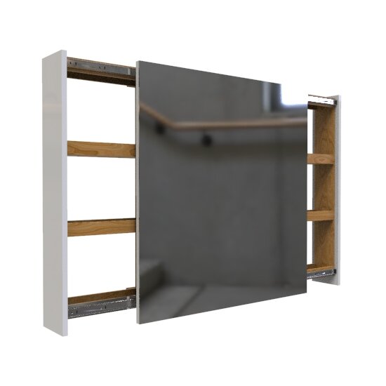 Как мы понимаем, слева или справа , а может и с двух сторон из за щита , на котором размещено зеркало на направляющих выезжают полочки, на которых мы и размещаем все те мелочи, что нам так необходимы в ванной комнате.