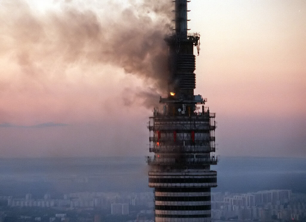 Пожар в телебашне высотой 540 метров вспыхнул 27 августа 2000 года и длился два дня. Погибли три человека, семеро пострадали, а вещание большинства российских телеканалов на Москву и Московскую область остановилось на несколько дней.
