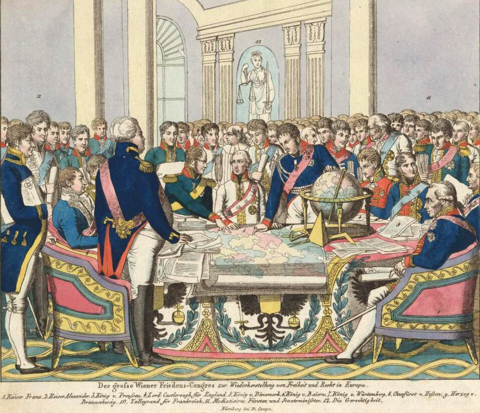 В октябре 1813 года силы новой антифранцузской коалиции в составе России, Великобритании, Пруссии, Австрии, Швеции, Испании и Португалии разбили французскую армию в битве народов под Лейпцигом. В марте 1814 года войска коалиции вошли в Париж, на французский трон был возведен Людовик XVIII, брат казненного короля. Наполеон сохранил титул императора, но был вынужден подписать акт отречения и отправиться в ссылку на остров Эльба для обсуждения и создания нового послевоенного устройства Европе. Был созван венский конгресс. События в мае 1814 года, мирный договор с Франции подписали Россия, Англия, Испания, Пруссия и Португалия. По этому договору Франция лишалась всех завоеванных в годы революционных войн территорий, после этого сентября 1814 года до июня 1815 был созван венский конгресс. Этот первый в мировой истории дипломатический конгресс собрался в Вене в нем приняли участие почти все европейские государства наибольшее влияние на конгрессе имели представители пяти держав России, Ве