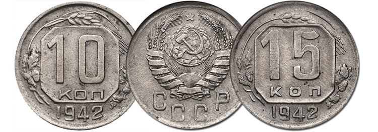 Редкость 10 и 15 копеек 1942 года, которые ценятся по 15.000 рублей каждая, можно объяснить так. После переезда монетного двора из Ленинграда, на Урал, в Краснокамск, в условиях военного времени, не сразу удалось начать полноценную чеканку необходимых монет. В следующем году выпуск монет стабилизировался. В итоге, 10 и 15 копеек 1942 года стали одними из самых редких за все время изготовления этих номиналов.