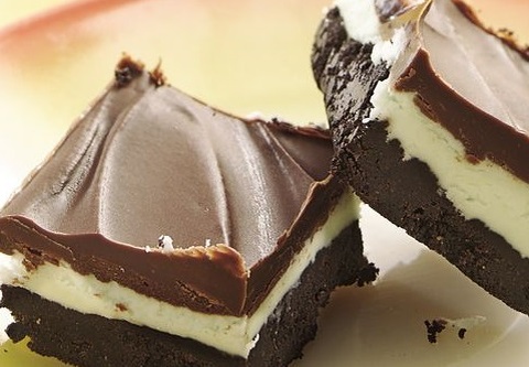 Равномерно распределите смесь мяты по крошке. В кастрюле объемом 1 литр растопите оставшуюся шоколадную стружку и 1/3 стакана масла на медленном огне, постоянно помешивая; равномерно распределить по смеси мяты перечной. Охладите, пока шоколад не застынет, от 10 до 15 минут. Для получения батончиков разрезать общий пирог на 5 рядов по 5 рядов.