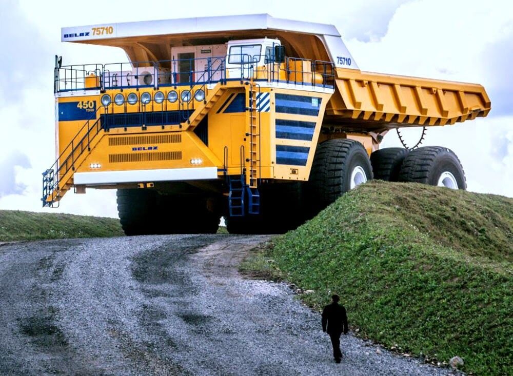 Самый большой самосвал в мире для перевозки породы БелАЗ-75710 - выпускается на белорусском заводе Его грузоподъёмность составляет 450 тонн, а полная масса почти 810 тонн. Внушительные размеры: В высоту более 8 метров, в ширину почти 10 метров, а в длину почти целый 21 метр. Гигант оснащён двумя дизельными двигателями с просто невероятной мощностью 4600 лошадиных сил и ещё он имеет полный привод и максимальную скорость не более 60 км/час. Но конечно из-за его размеров у него есть большой недостаток в расходе топлива самосвала. Кстати в кабине на высоте трёх этажного дома машинист БелАЗа чувствует себя как в самолёте.
