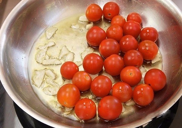 1. На сковороду отправьте оливковое масло. Очистите и нарежьте пластинками чеснок. Выложите на сковороду и обжарьте пару минут. Добавьте помидоры, предварительно вымыв и обсушив их.
