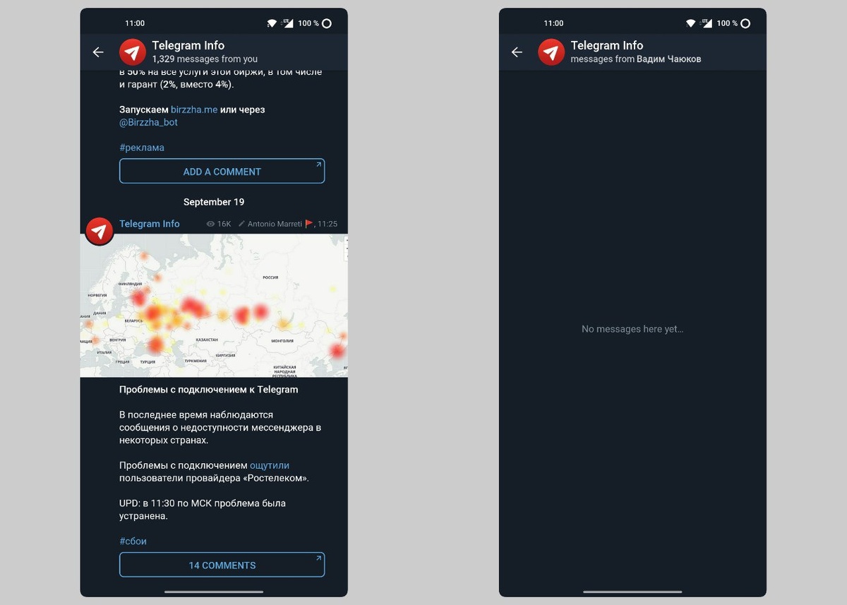 Теперь можно посмотреть только свои посты. При попытке посмотреть посты от другого администратора на канале будет отображаться надпись «Сообщений нет».