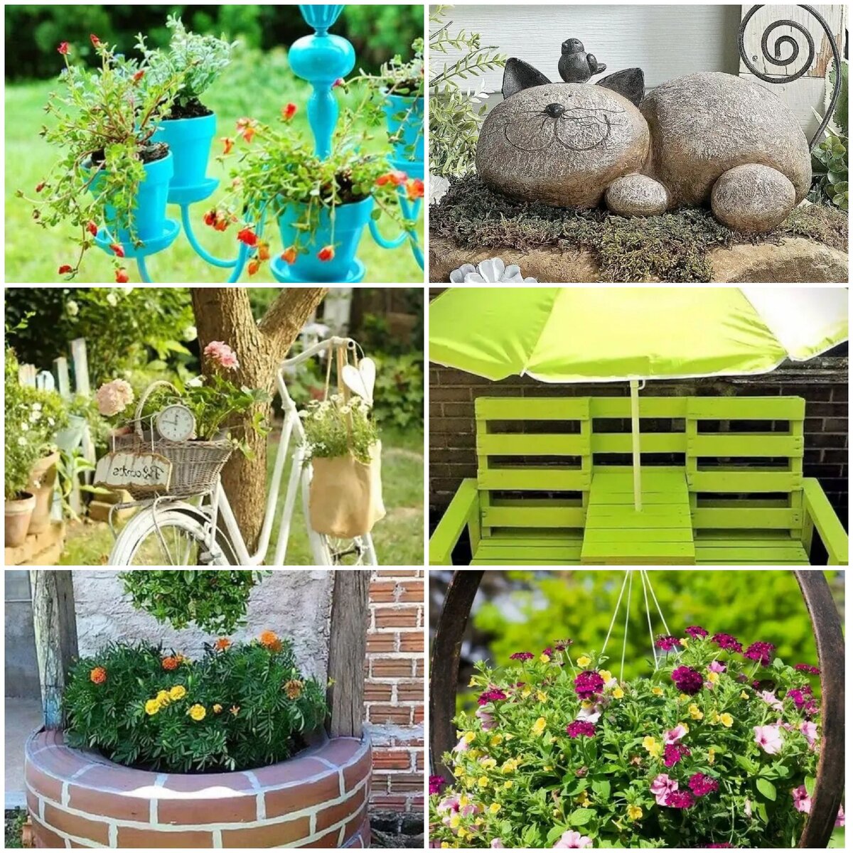 Декор важная составляющая дачи, если вы планируете на ней отдыхать, а не только работать. Люстра, отличное место для цветов! Простая идея, нужно всего лишь достать старую люстру и посадить в неё цветы. Как красиво она смотрится! В первый раз вижу такую необычную самоделку. Моя оценка: 6 из 10. Велосипед как элемент интерьера. Видел такой велосипед в одном отделе, только без цветов. Белый цвет велосипеда, гармонично смотрится на фоне растительности. Вы будете каждый раз наслаждаться им, проходя мимо. Нужно только велосипед где то найти) Моя оценка: 8 из 10. Колодец из старых шин. Не простая идея в плане создания, но какой результат! Цепляет внимание. Запланировал сделать себе такой же на дачу. Моя оценка:8 из 10. Место релакса из поддонов. Поддоны наше будущее. При помощи фантазии и смекалки, я думаю из них можно построить дом. Мягкие насадки придётся прикупить и зонтик. Как классно на нём попивать бокал вина, душевно разговаривая с девушкой, под закат. Моя оценка:6 из 10. Каменный