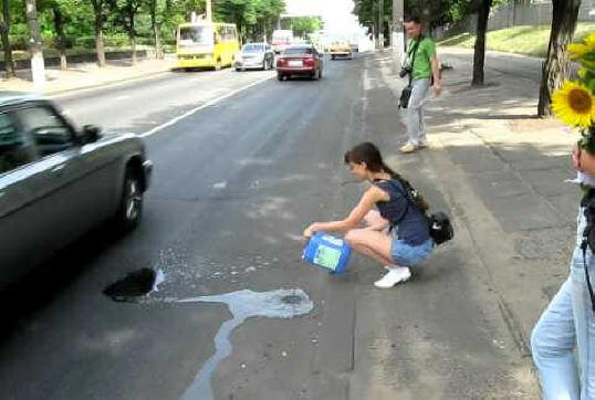 ( на фото украинский эксперимент в городе Николаеве, где "вода течет вверх". Опыт проводит профессор кислых щей, которой не лень было волочь канистру с водой, что бы полить асфальт. О теодолите она видно не слышала. Рядом два созерцателя этого академического геморроя. Не хватает попа с кадилом.
