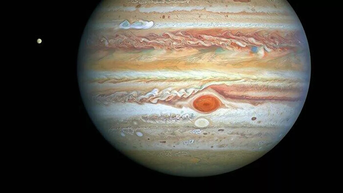 Космический телескоп "Хаббл" сделал новый сверхчеткий снимок Юпитера, на котором запечатлен мощный шторм, распространяющийся в северных широтах планеты. В кадр также попала ледяная луна Европа. Изображение доступно на официальном сайте проекте. Фотография была сделана 25 августа 2020 года, когда Юпитер находился в 653 миллионах километров от Земли. Насыщенные цвета связаны с соединениями водорода и гелия в атмосфере планеты. Вихревые облака, движимые ураганными ветрами, создают разноцветные полосчатые структуры. Какие-то из них меняются из года в год, а некоторые, как Большое Красное Пятно — крупнейший атмосферный вихрь в Солнечной системе — остаются на месте столетиями. Космический телескоп "Хаббл" сделал новый сверхчеткий снимок Юпитера, на котором запечатлен мощный шторм, распространяющийся в северных широтах планеты. В кадр также попала ледяная луна Европа. Изображение доступно на официальном сайте проекте. Фотография была сделана 25 августа 2020 года, когда Юпитер находился в 653