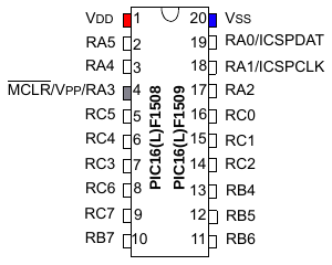 Я выделил красным положительный вывод питания, а синим отрицательный. Серым цветом выделен вывод напряжения программирования. Хоть мы сегодня и не касаемся вопросов программирования микроконтроллеров, все замечу, что этот вывод является многофункциональным и может использоваться и при обычной работе микроконтроллера.
