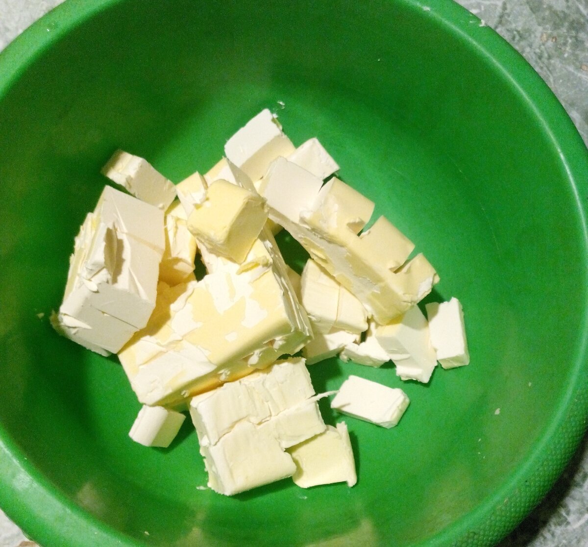 Маргарин нужно брать из холодильника, чтобы он был твердый. Его я порезала на кусочки, всыпала муку и растерла все в руках.