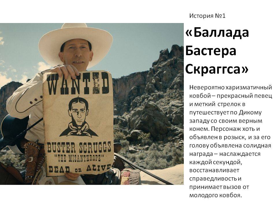 Это не полнометражный фильм, здесь нам покажут 6 не связанных сюжетно историй, каждая раскроет особенности жизни на Диком Западе: