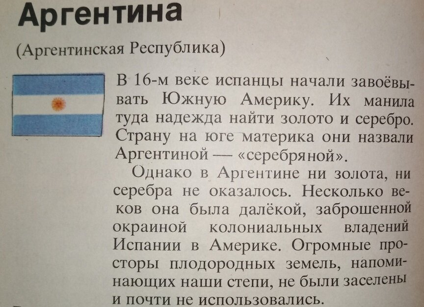 Однако в Аргентине ни золота, ни серебра не оказалось. Несколько веков она была далёкой, заброшенной окраиной колониальных владений Испании в Америке. Огромные просторы плодородных земель, напоминающих наши степи, не были заселены и почти не использовались.