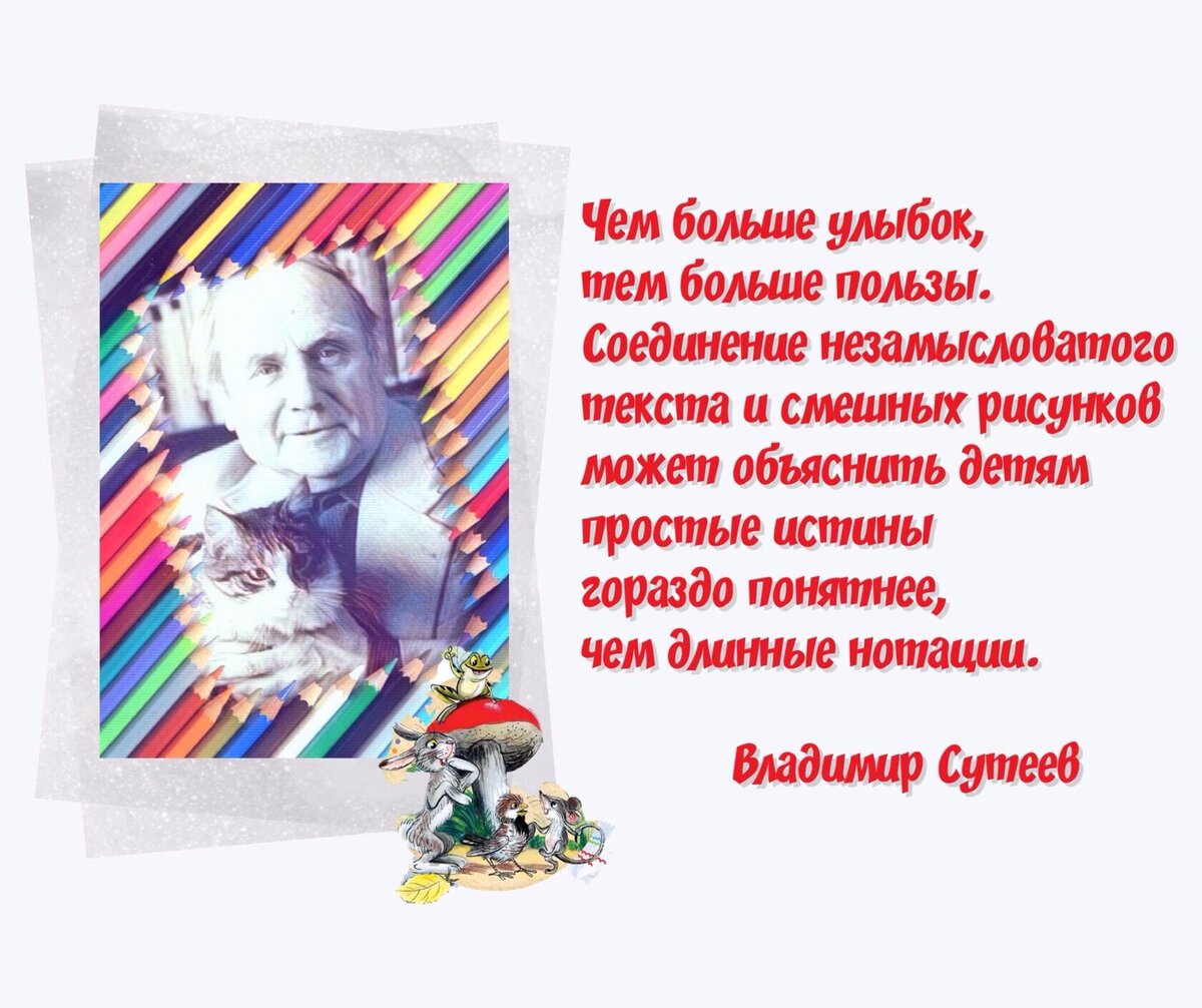 🧸 Не найдётся ни одного человека в нашей стране, который бы не был знаком с творчеством Владимира Сутеева. Может быть, и имени его не припомнят, но уж наверняка знают Чиполлино, доктора Айболита, Пифа, Мойдодыра, Кота-рыболова, Козленка, который умел считать до десяти, и огромное количество других добрых и веселых героев, которых он нарисовал для детских книг и мультфильмов. Его самые известные работы - иллюстрации к стихам и сказкам Корнея Чуковского, Самуила Маршака, Сергея Михалкова. Владимир Григорьевич стоял у истоков отечественной мультипликации - ещё в 1928 году он создал первый советский звуковой мультфильм «Улица поперек». А ещё он писал замечательные книжки для детей, которые нам всем также хорошо известны: «Кто сказал «мяу?», «Котенок по имени Гав», «Кот-рыболов», «Петя и Красная Шапочка», «Мы ищем Кляксу». Все его простые и яркие книги предназначались малышам - с множеством рисунков, сопровождающих почти каждое предложение. Сейчас бы его книги назвали комиксами, а поч