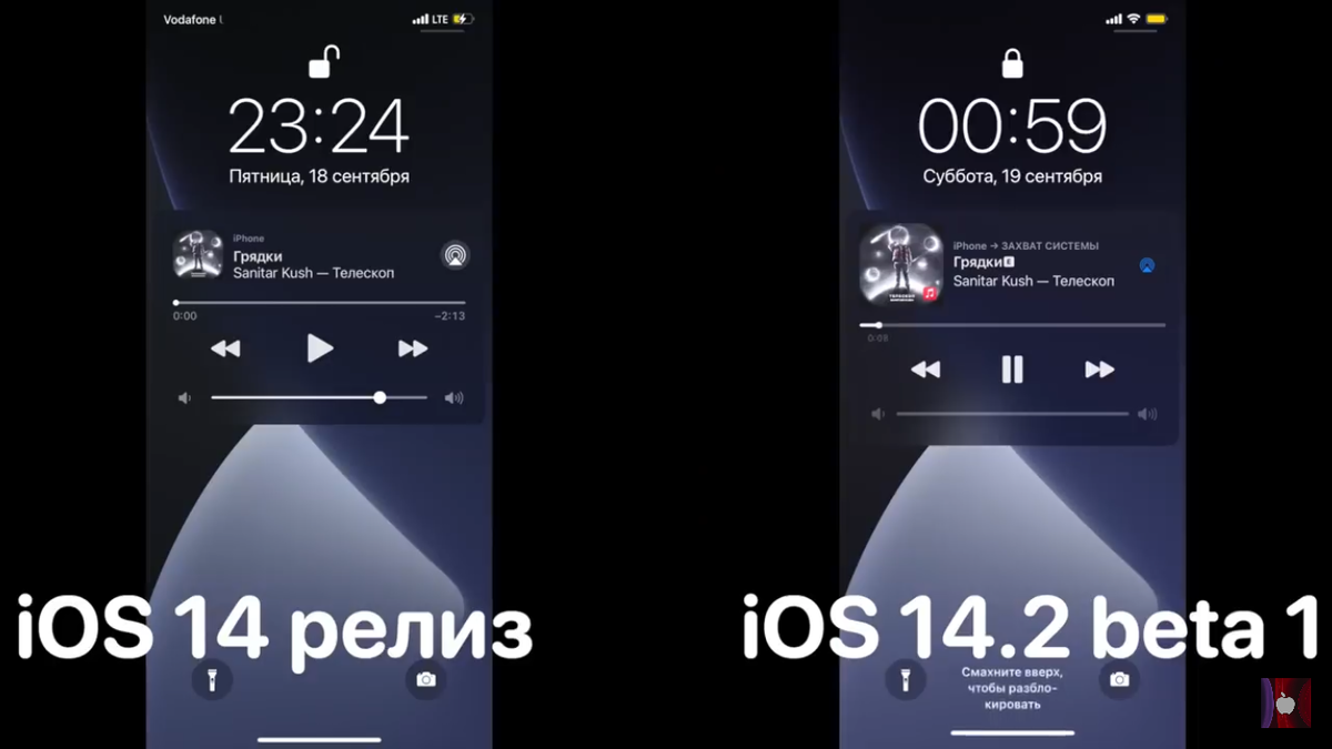 На экране блокировки окно плеера музыки стало больше. Вместе с ним так же увеличились все элементы управления, особенно обложка. При перемотке песни видно её таймкод, то есть можно перематывать на тот отрывок который вас интересует. Если мы нажмём на иконку AirPlay, то увидим очень красивое обновлённое меню Теперь если музыка не проигрывается и вы подключаете наушники, в плеере на экране блокировки высвечиваются краткий список избранных либо недавно прослушанных плейлистов включая еженедельные подборки. В нем можно выбрать что послушать прямо сейчас Так же поменяли дизайн проигрывателя и в центре управления, он стал немного больше и занимает почти весь экран, увеличились все элементы управления. Ещё появилась кнопка «прочее» где теперь находятся все девайсы на который можно выводить звук В приложении музыка поменялась меню поделиться, теперь оно находится внизу экрана и есть очень красивая анимация В пункте управления появилась возможность добавить “Shazam”. Чтоб включить эту фиш
