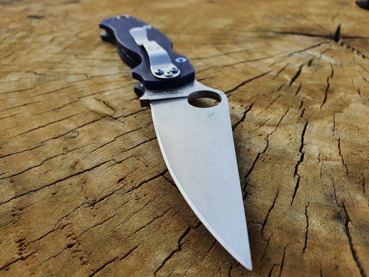 3. Форма клинка. Она тут традиционная для компании Spyderco, так называемый тройной клин, т.е.нож сужается по всем трём плоскостям. Лезвие достаточно толстое, 3,7мм но благодаря тому что оно широкое и имеет спуски от обуха нож получился фантастически резучим, сведение 0,5 мм. Минус такого клинка пожалуй только один, это достаточно слабый кончик, ковырять и сильно нагружать его не стоит.