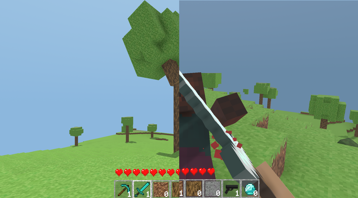 Блоки теперь имеют физику, а у зомби теперь есть ragdoll. Из минусов - когда игрок идет или запрыгивает на блоки экран начинает очень сильно трястись, и из-за этого играть проблематично и кроме зомби здесь больше нету никаких мобов. Было бы интересно увидеть физику воды, но увы воды здесь нет.