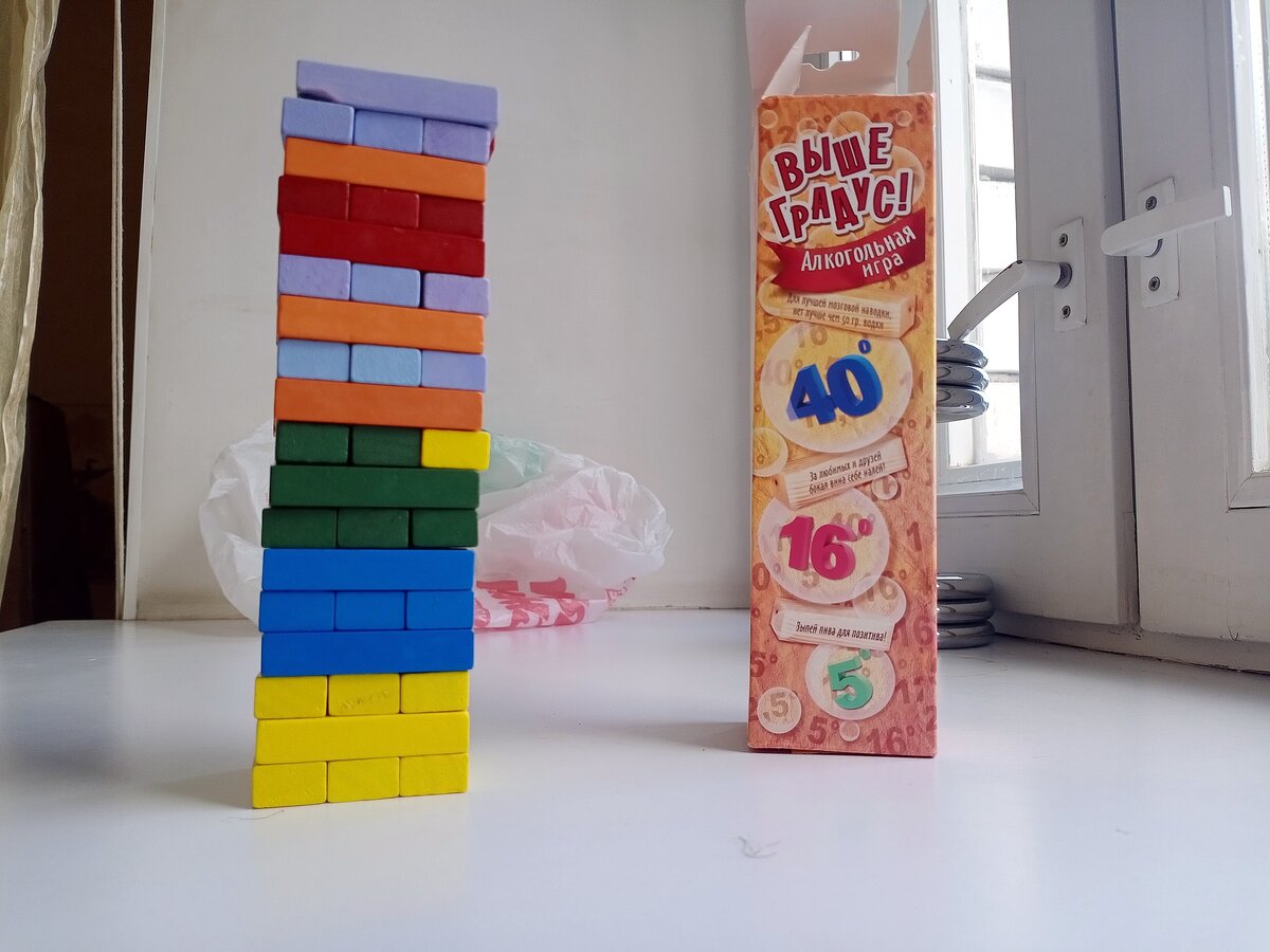 Даже в то время у нас не было цели нажраться. Бруски включают в себя задания выпить: водку, пиво и вино. Бюджетно, грубо говоря, но! Их невозможно выставить таким образом, чтобы градус повышался. Также, как вы знаете, мешать в себе несколько алкогольных напитков... такое. Нет, безусловно, можно примерно запомнить, какое задание соответствует определенному цвету. Но тогда теряется смысл настольной игры Дженга. Вы тянете то, что должны тянуть, а не то, что хочется. Полагаю, что тем, кто всё-таки сыграл в данную башню по правилам, с утра (или уже к вечеру) было очень плохо. Смысл настолок в том, чтобы в итоге было хорошо :-)