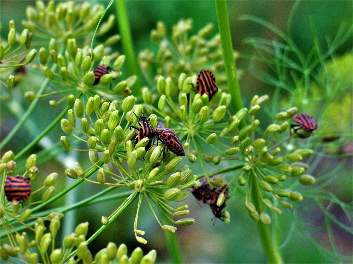 Однажды на мой сад напали неведомые мне твари. Вернее, даже не на сад, а на огород. Это были яркие полосатые крупные жучки с пузиком в горошек. Их было довольно много, но сидели они исключительно на укропе. Но... при этом рука не поднималась как-то избавляться от этих насекомых, уж очень они были живописны. И я их фотографировала, рассматривала, изучала. Стала разбираться, кто это, опасные ли вредители, и что делать, если их появится слишком много. И выяснила - это яркое красивое насекомое – клоп щитник. Еще его называют итальянский клоп, за раскраску, напоминающую форму швейцарской гвардии, охраняющей резиденцию Папы Римского в Ватикане. Издалека заметный «боевой раскрас» отпугивает птиц, сигнализируя: не тронь, хуже будет, так как есть у этой гвардии свое секретное химическое оружие – резкий неприятный запах. Питается итальянский клоп исключительно соком растений семейства зонтичных (сельдерейных). Поэтому встретить его чаще всего можно на соцветиях укропа, тмина, аниса, сныти и т