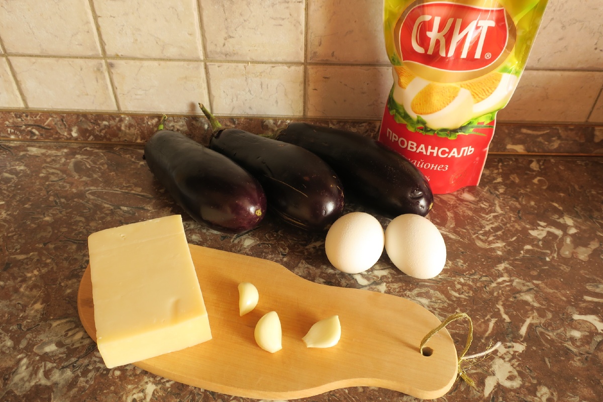Пока баклажаны лежат, займемся начинкой. Вареные яйца и сыр натираем на мелкой терке, чеснок пропускаем через пресс, заправляем начинку майонезом. По вкусу можно добавить перец. Не солим, так как сыр и майонез соленые.