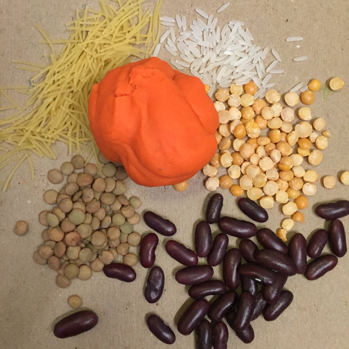 Для лепки я взяла одну баночку пластилина Play-doh. Он очень мягкий и на нем хорошо видны отпечатки. Обычный пластилин будет слишком твёрдым. Можно взять любе тесто для лепки, восковой пластилин или сделать соленое тесто самим (я как-нибудь