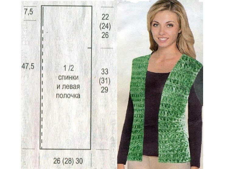 Используем 600 (650) 700 г слегка меланжевой зеленой пряжи, желательно из 100 % хлопка, спицы № 10 и № 12, крючок № 10. Основной узор вяжется из четного числа петель, в их число входят и кромочные петли. 1-й ряд вяжем только лицевыми петлями. 2-й ряд за кромочной, две петли вяжем вместе лицевой петлей и делаем накид. Таким образом вяжем до конца ряда. В 3-м ряду все петли вяжем лицевыми петлями, а накиды ряда предыдущего, спускаем слегка вытягивая лицевые петли. В 4-м ряду: кромочная, *1 лицевая, из поперечной нити вывязываем 1 лицевую скрещенную петлю, и повторяем от * нужное количество раз, последняя петля кромочная. 1-й ряд вяжется только 1 раз вначале, далее узор повторяем со 2-го ряда по 4-й. При каждом таком повторе лицевые ряды будут становиться изнаночными рядами, и наоборот. Плотность такого узора составит 10 петель на 8 рядов в 10 см образца. Вяжем спинку, набрав на спицы № 10 52 (56) 60 петель. С 3-го ряда переходим на спицы № 12. На уровне 47,5 см от начала вязания, разделяем для выреза, работу на две равные части, и каждую часть вяжем отдельно. Все петли закрываем на уровне 55 см. Снова берем спицы № 10 и приступаем к левой полочке. Набираем 26 (28) 30 петель и вяжем тем же узором все 55 см полотна, перейдя в 3-м ряду на спицы № 12. Правую полочку вяжем также. При сборке изделия, делаем плечевые швы по ширине полочек. Вырез горловины и края полочек обвязать 1 рядом соединительных столбиков. Выполняя боковые швы, оставляем открытыми верхние 22 (24) 26 см для пройм.