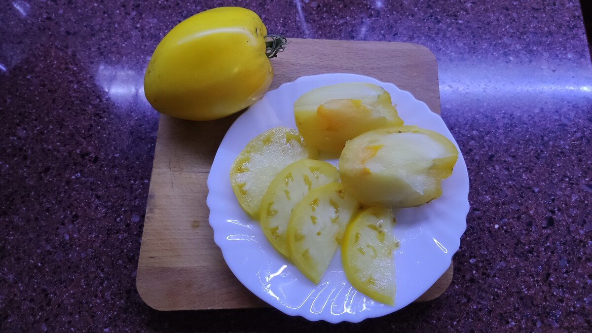 Томаты крупные, желтые, обладают нежным вкусом, практически без кислинки. Настолько нежным, что практически не уловила его. Вообще, внешний вид и цвет слегка не соответствуют, указанному на упаковке, но как сказал производитель, эти показатели могут зависеть и от почвы, и от условий произрастания, и от агротехники.
