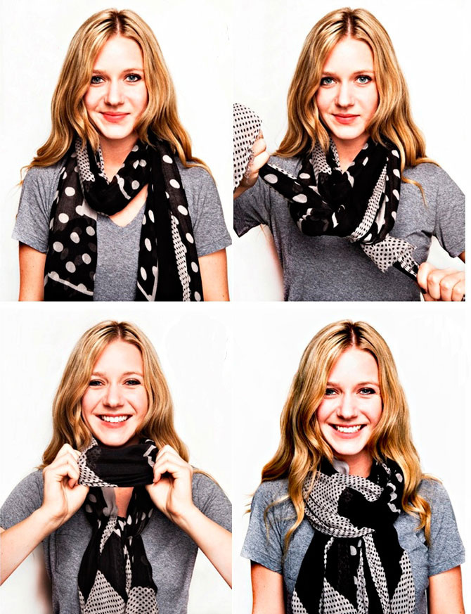 Длинный теплый шарф. Красивый, простой и достаточно оригинальный способ, как завязать длинный теплый шарф. Завязанный таким образом аксессуар не только надежно защитит шею, но и украсит пальто или водолазку. 2. Крендель Крендель из шелкового платка. Сложенный в треугольник шелковый платок можно завернуть в очаровательный замысловатый крендель. Платок повязанный таким образом станет эффектной деталью делового или романтического образа, а также защитит горло от ветра. 3. Узел-коса Шарф, завязанный в узел-косу. Простой и весьма эффектный способ защитить свой затылок от ветра и превратить теплый шарф в красивый аксессуар. 4. Жгут Ожерелье-жгут из легкого шарфа. Сегодня, шарфы предназначены не только для защиты от холода, но и для украшения изящной и красивой шеи. Например, простые манипуляции помогут превратить легкий длинный шарфик в красивое ожерелье жгут. 5. Дикий запад Платок завязанный в стиле дикого запада. Оригинальным завершением повседневного образа станет платок,