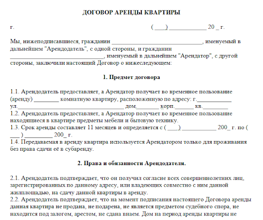 Договор аренды квартиры между физическими лицами В некоторых случаях сдавая или снимая квартиру люди предпочитают обходиться без договора. Это называться — аренда без договора, ограничиваясь лишь устными договорённостями. Но чтобы свести финансовые и другие риски и арендатора, и собственника жилья к минимуму, договор аренды квартиры всё же лучше заключить. Ведь он является основным документом, который регулирует отношения между арендатором жилья и его собственником. Договор аренды жилья, как правило, имеет типовую форму и очень часто скачивается сторонами из интернета. В рамках данного материала поговорим о том, какие пункты он обязательно должен содержать такой договор, чтобы обе стороны чувствовали себя безопасно,а в случае возникновения недопонимания могли обратиться в компетентныеорганы или суд. Образцы договоров по аренде жилья для физических лиц приведены в конце статьи. В образце договора аренды обязательно должны быть включены следующие пункты: 1. Стороны по договору аренды ква