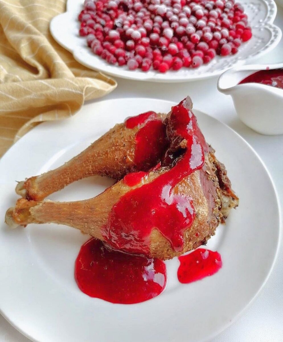 ⠀ Нам понадобится: - утка - 1 шт - мёд - 1 ст.л. - соль - 1 ч.л. - розмарин (сушеный) - 1 ч.л. - мускатный орех - 1/2 ч.л. - чёрный перец - по вкусу ⠀ для соуса: - клюква - 250 гр - яблоки - 2 шт - сахар - 80 гр ⠀ Готовим маринад: Смешиваем все специи и добавляем растопленный мёд, хорошо перемешиваем. Утку избавляем от излишек жира. Тщательно обсушим бумажным полотенцем. ⠀ Хорошо натираем утку маринадом внутри и снаружи. Накрываем утку плёнкой и отправляем в холодильник минимум на 4 часа (лучше на ночь). ⠀ Духовку разогреваем до 180 градусов, кладём утку в рукав для запекания и запекаем 1,5 часа до готовности. Если запекаем без рукава, то каждые 20 минут поливаем утку растаявшим жиром из противня. ⠀ Для соуса очищаем и мелки нарезаем яблоки. Отправляем клюкву, сахар и яблоки в сотейник и ставим на средний огонь. Как только яблоки и клюква станут мягкими - соус готов. Хорошенько пробиваем блендером до однородности. ⠀ Готовую утку поливаем соусом и подаём горячей