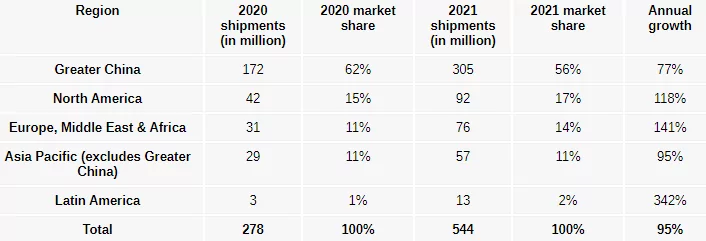 5G-революция идёт полным ходом. Сейчас на рынке появляется всё больше смартфонов с поддержкой сотовых сетей пятого поколения, причём, это уже не только флагманы, но и модели среднего класса. Их продажи к концу этого года, по оценкам аналитиков из Canalys, составят почти 280 миллионов. В своём новом докладе аналитики исследовательской фирмы Canalys заявили, что в течение 2020 года производители поставят в общей сложности 278 миллионов 5G-смартфонов. Причём, 62% из них или 172 миллиона будут проданы на территории Китая. А уже в следующем году объём продаж смартфонов с поддержкой сетей нового поколения увеличится почти вдвое до 544 миллионов. Рост спроса будет наблюдаться на всех ключевых рынках, включая Китай, Северную Америку и Европу. А наибольший всплеск продаж аналитики прогнозируют в Латинской Америке. Там поставки 5G-смартфонов вырастут на 342% до 13 миллионов.