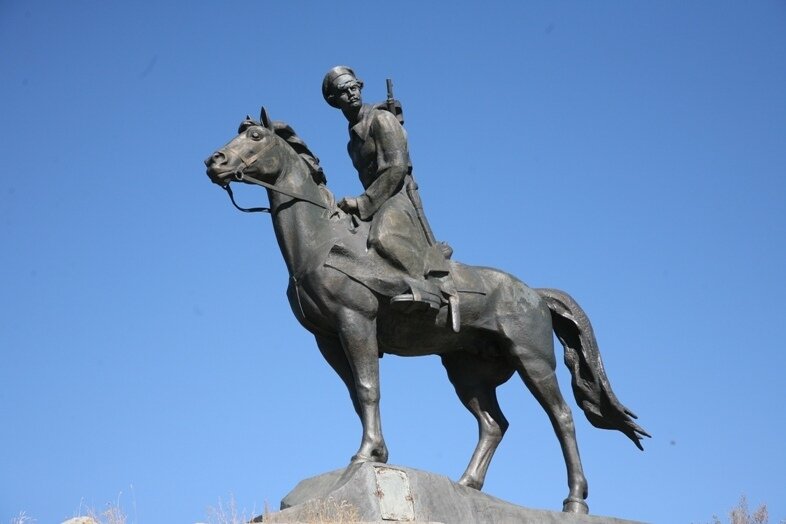 Автор скульптурной композиции Н. В. Можаев, Заслуженный художник УССР. Материал: бронза. Высота скульптуры – 6 метров, высота с насыпным курганом – 14 метров. Вес – 8 тонн. Макет скульптуры, которой вначале дали название «Трубач», выполнен в бронзе (высота 70 см). Позже композицию назвали «Орлёнок», затем - «В донских степях».