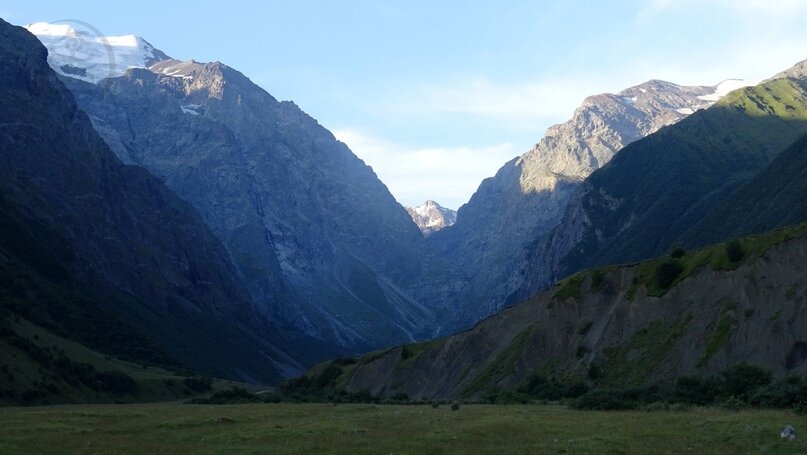 Главный перевал на пути – Архонский 2234 м. Интересно, что на вершине перевала безымянная развилка. Дорога в Алагир уходит на спуск, а слева примыкает восходящая колея в сторону ущелья Цазиу. Естественно пошли было проверить ее, но вскоре одумались – время вечернее, пасмурно, да и дорожка уж больно узка и не накатана. Кстати гром здесь звучит интересно. Не раскатами с паузами как внизу, а стоит постоянный нескончаемый рокот.