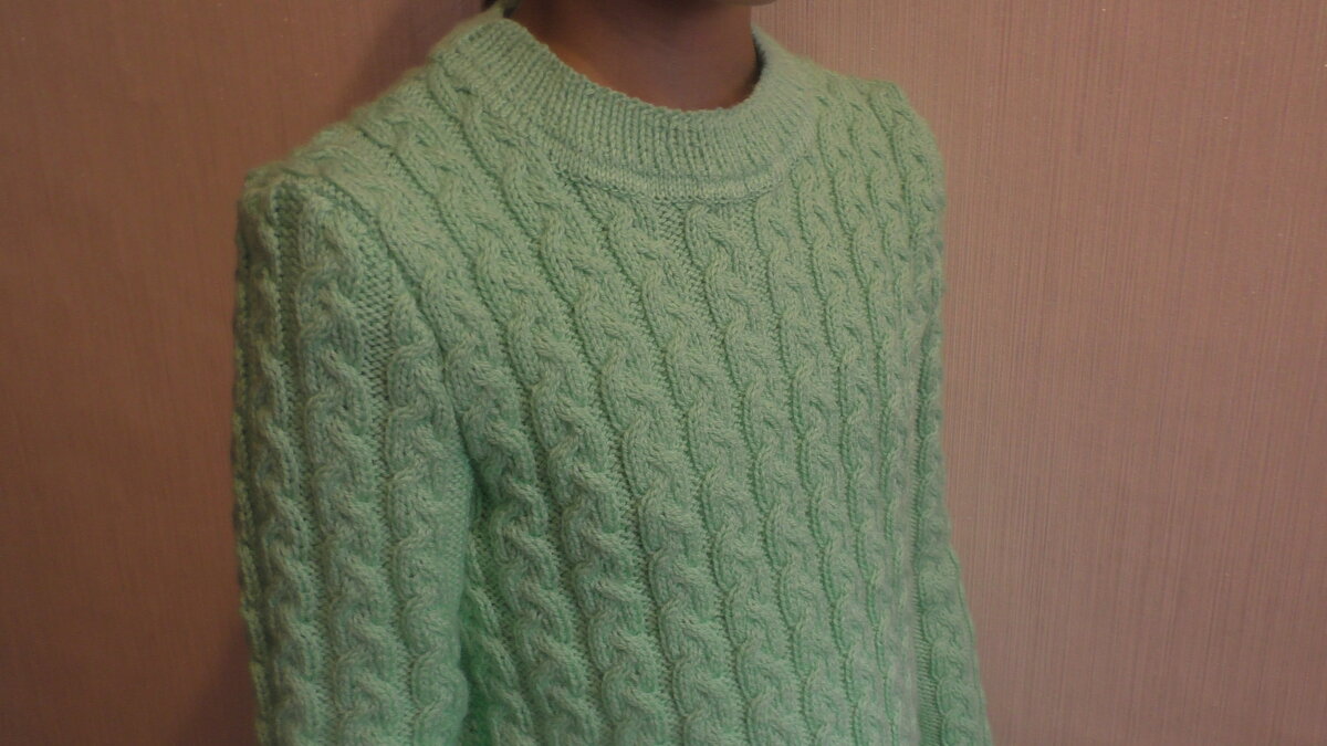 Для девочки 10 лет ростом 145 см потребуется около 350 граммов пряжи. У меня это пряжа ПЕХОРКА бирюзового цвета толщиной 400 м в 100 г. Спицы № 2 для резинок 1х1 и №3 для основного узора. Основной узор - КОСЫ. Как их вязать, можно посмотреть здесь: