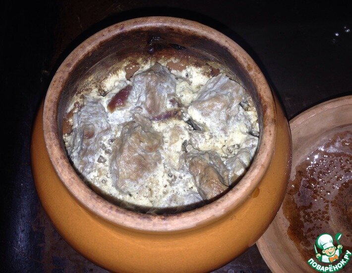 3.В горшочек наливаем ложку растительного масла и укладываем лук с мясом, перемешиваем. Накрываем крышкой и ставим в духовку (180 градусов) на 2 ЧАСА.