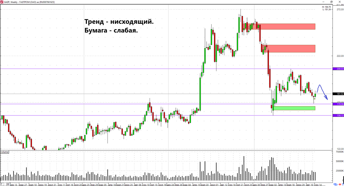 Бумага слабая, тренд – нисходящий. Этих двух факторов мне бы хватило, чтобы не добавлять Газпром в инвестиционный портфель.