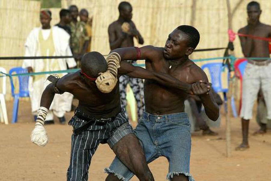 Агрессивный африканский бой в диких условиях привлекает зрителей своей зрелищностью. Этот вид спорта внешне напоминает бокс, но участники борются, не имея никакой защиты. Боксеры оборачивают веревкой свою сильную руку, которой и наносят удары. Другая рука используется для защиты от противника. Раньше соперники могли пропитывать веревку смолой или посыпать стеклянными осколками. Это боевое искусство берет древнее начало от племени Хауса в Нигерии. Изначально участниками боев были почитаемые представители касты мясников, которые устраивали кулачные драки для развлечения народа в праздничные дни. В современное время любой мужчина или даже ребенок, имеющий хорошую выносливость и подготовку, может встать на ринг. Рингом в дамбе служит обычная площадка на земле, вокруг которой всегда собирается взволнованная публика. Перед началом боя африканские музыканты исполняют народные композиции, прославляя спортсменов. В этом виде бокса не существует разграниченных весовых категорий – габариты против