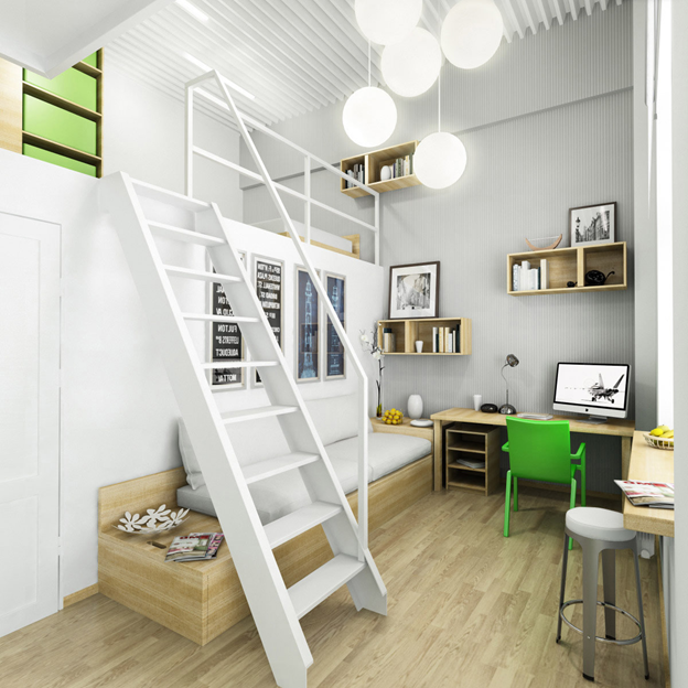 квартире высокие потолки? Замечательно! Значит, прекрасно уместится подвесной подиум для сна, двухъярусная кровать для малышей, кровать-чердак с полезным пространством под ней – гардеробной для ребенка, местом для учебы, игровой зоной.